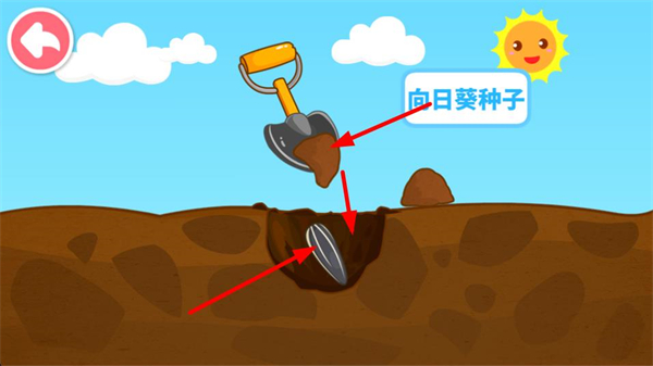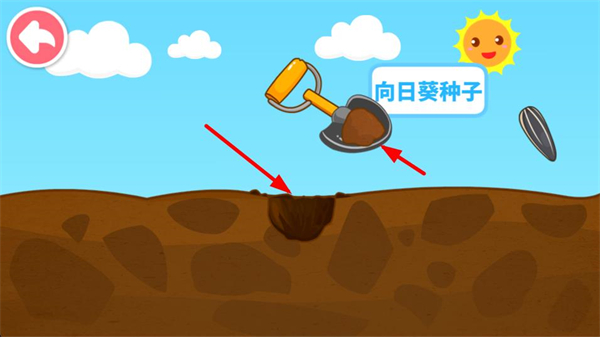 2、先使用鏟子在土壤上挖出坑洞,再將向日葵種子對應放到坑洞位置,為種子的種植做好前期準備。