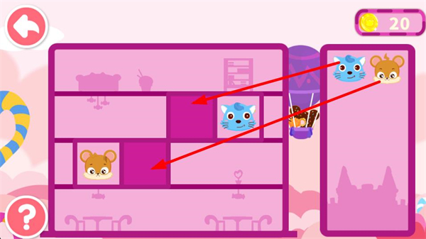 1、將右側的萌物圖標拖到左側架子的對應空位,把相同樣式的萌物放到架子上,完成初始的房間分配,推進游戲進程。