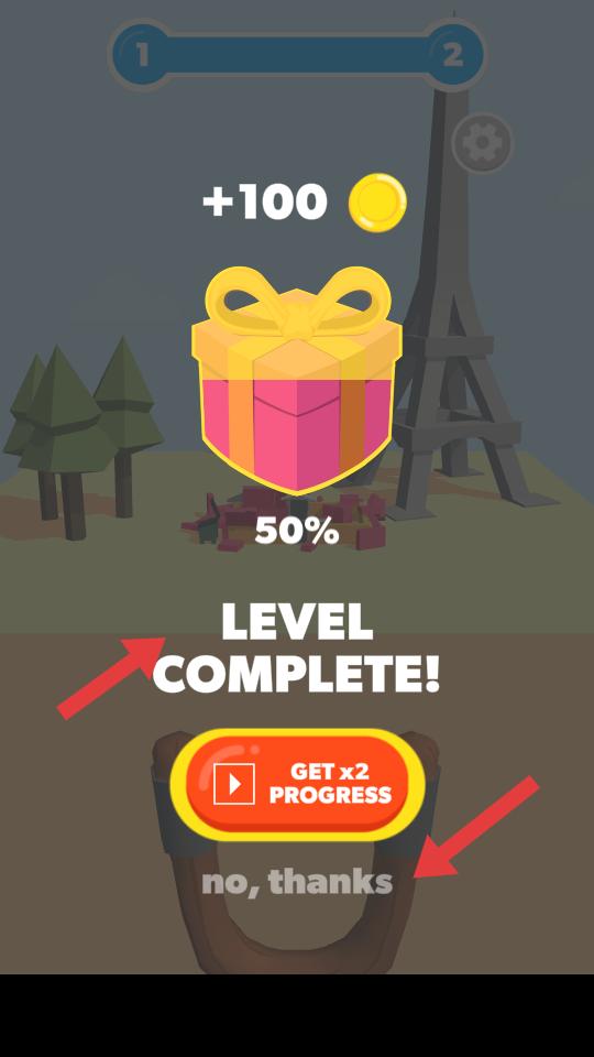 4、成功完成關卡后,顯示LEVEL COMPLETE,獲得金幣獎勵,可選擇加倍進度或直接繼續,開啟下一關。