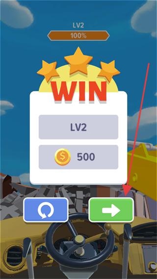 4、當成功拆除建筑進度條達到100后,會出現WIN界面此時可以選擇綠色箭頭按鈕,進入下一關繼續拆樓挑戰。
