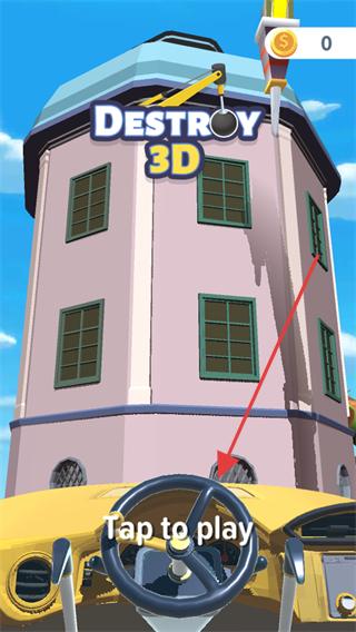 1、進入游戲看到帶有建筑和Taptoplay提示的界面,點擊屏幕開始拆樓游戲,操控拆樓設備對建筑進行拆除。