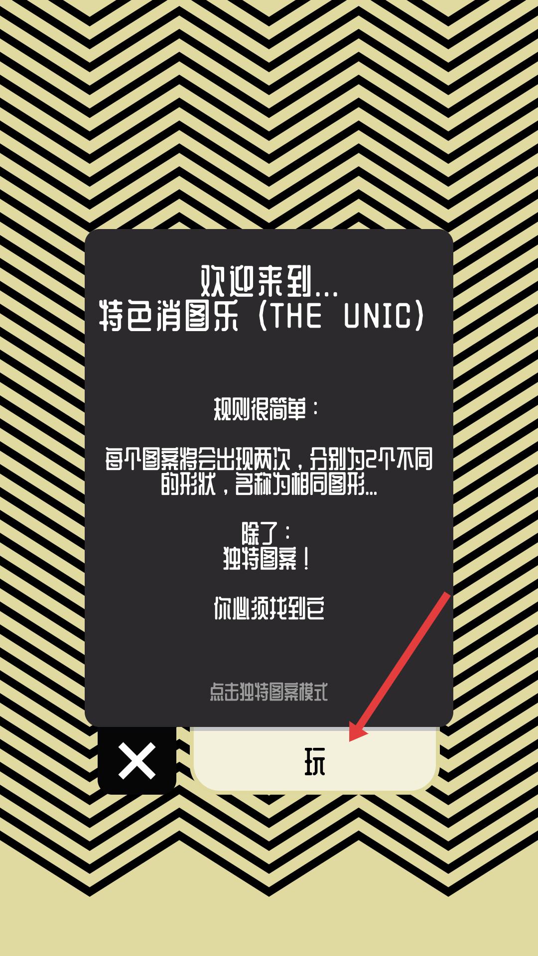 1、游戲界面顯示歡迎來到特色消圖樂,規則是找獨特圖案,點擊玩按鈕,開始游戲。