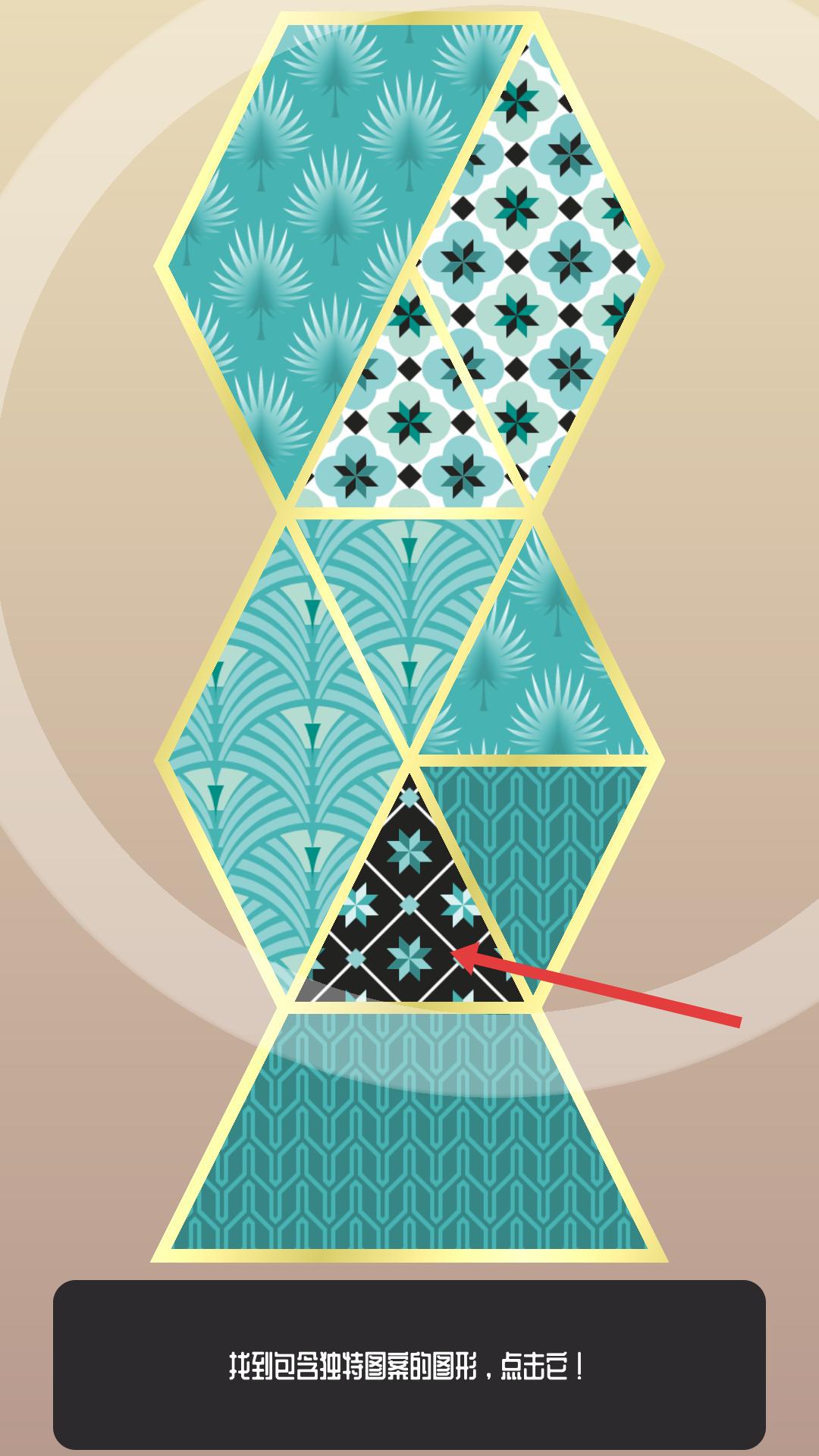 2、游戲提示找到含獨特圖案的圖形,仔細觀察各圖形,點擊帶有獨特黑色底紋星形圖案的三角形。