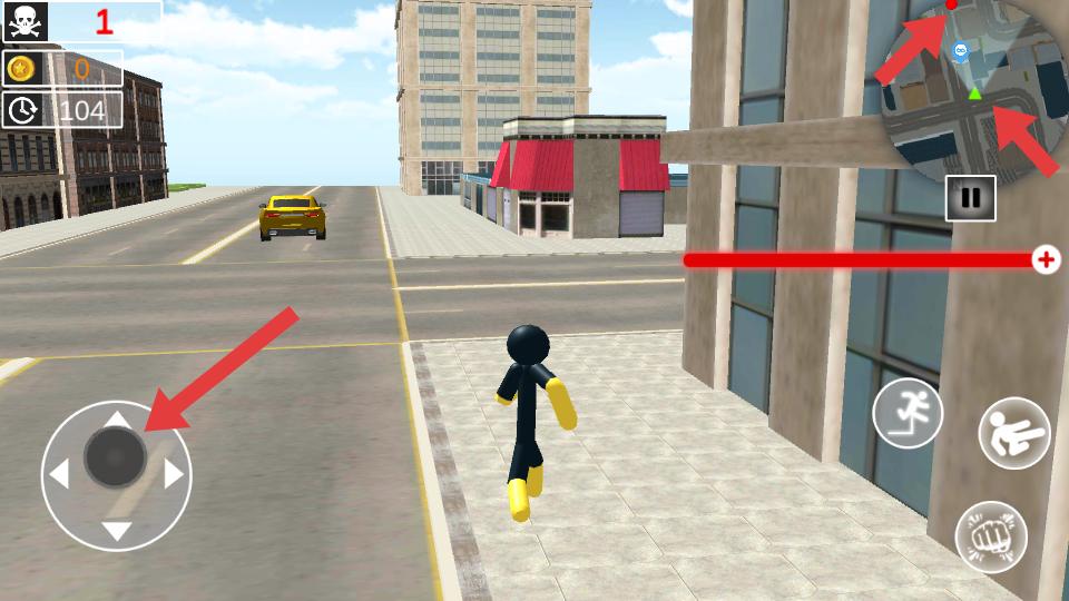 3、游戲中通過左側虛擬搖桿操控火柴人移動,根據右側地圖等提示,前往目標位置,執行任務。