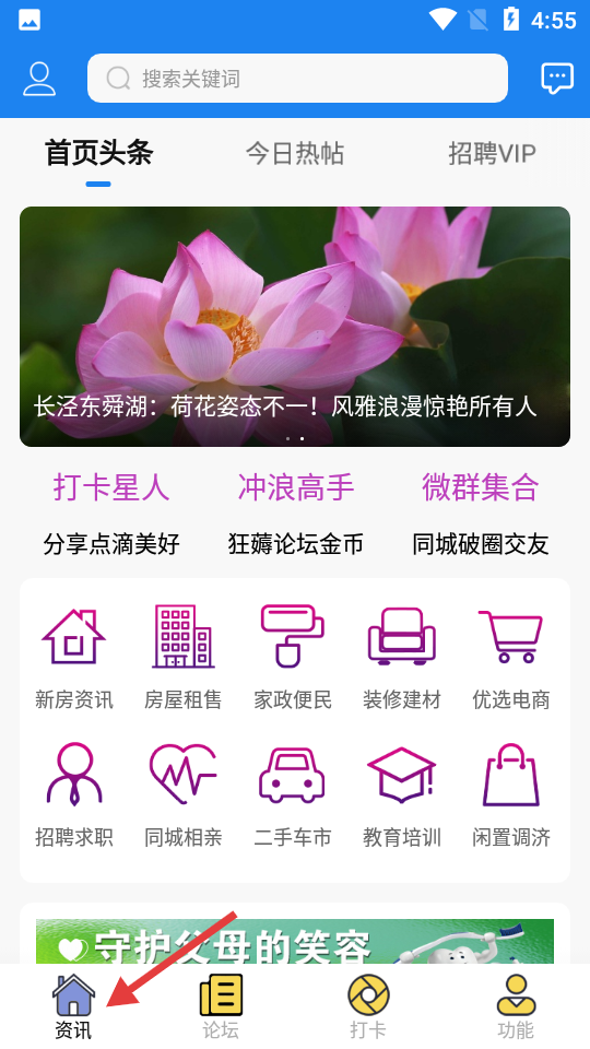 1、江陰論壇APP首頁,上方有搜索框,首頁頭條展現本地資訊,下方分布新房、招聘等功能區,滿足多樣生活需求。