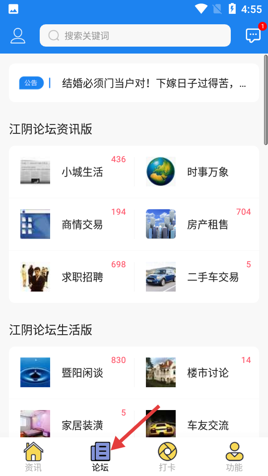 2、進入論壇頁面,分資訊版和生活版,囊括小城生活、房產租售等豐富板塊,直觀顯示帖子數量。
