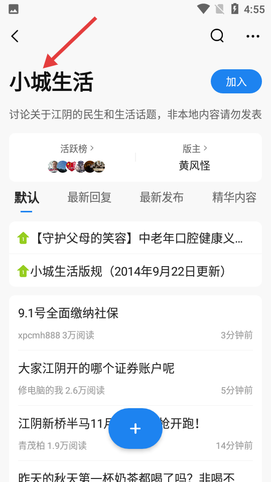 3、小城生活板塊聚焦江陰民生,有活躍榜和版主信息,帖子按默認等多種方式排序,方便用戶交流討論。