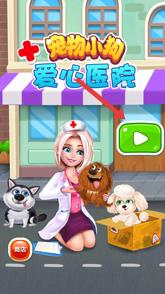 1、打開游戲,看到有醫護人員、小狗和開始按鈕的界面,點擊開始按鈕,就能進入游戲,開啟寵物醫療之旅。