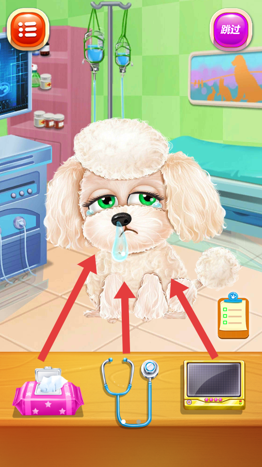 3、進入后會看到生病的小狗,下方有濕巾、聽診器等醫療工具,根據小狗癥狀,選擇合適工具為其檢查、護理。