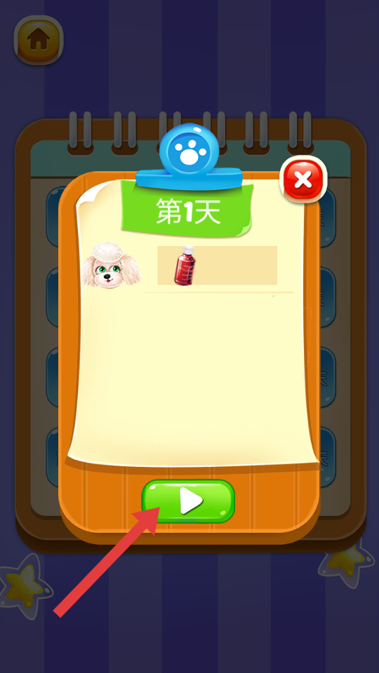 2、接著會出現顯示第1天和相關物品的界面,點擊綠色開始按鈕,就能開啟當天的寵物醫療任務,為小狗治療。