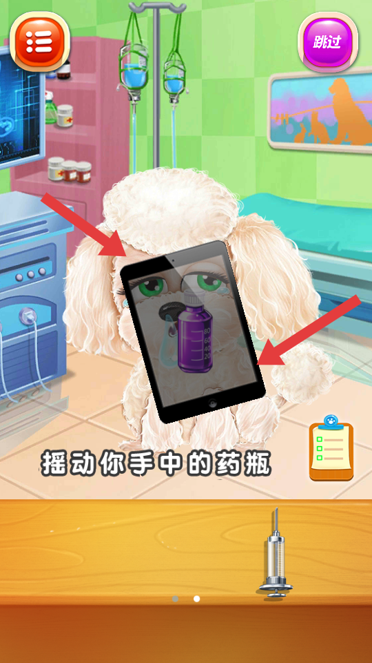 4、治療過程中,按照提示搖動手中的藥瓶,準備好藥物后,還可使用注射器等工具,為小狗進行進一步治療。