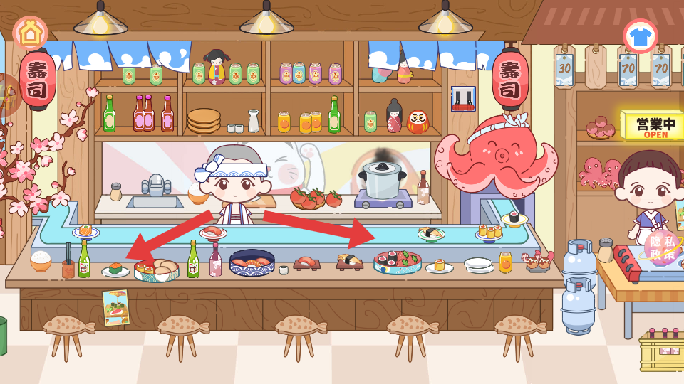 3、進入壽司店場景,這里有豐富的食材和廚具,能參與制作壽司等美食,體驗烹飪的樂趣。