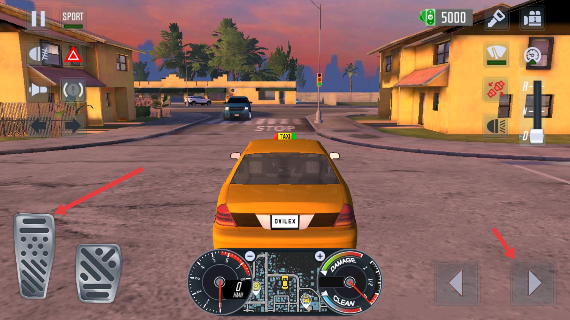 3、進入駕駛界面后,利用左側踏板控制車速,右側方向按鈕控制行駛方向,按照地圖指引,在城市道路中駕駛出租車前行。