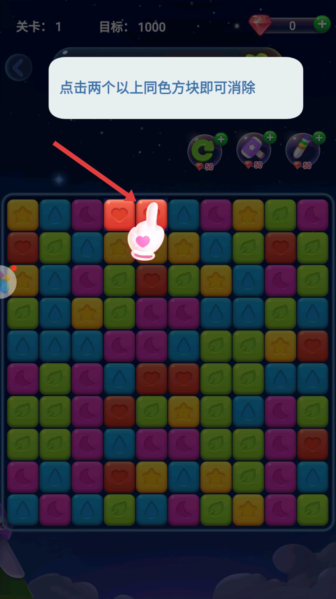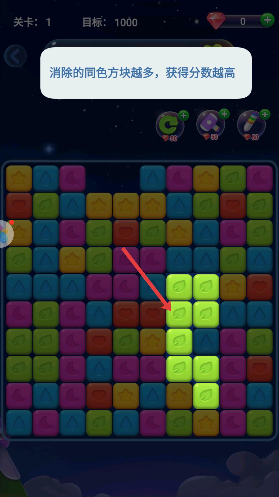 2、進入關卡1提示點擊兩個以上同色方塊可消除,按照提示找到同色方塊并點擊,開始消除操作,積累分數。