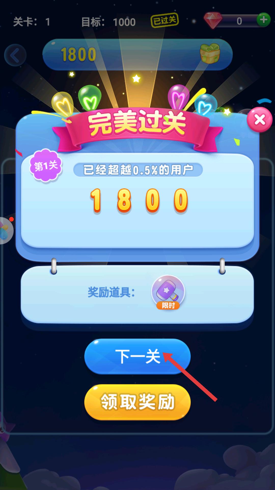 4、關卡1完美過關后界面顯示分數和獎勵道具,點擊下一關,繼續挑戰新的關卡,提升消星星技巧。