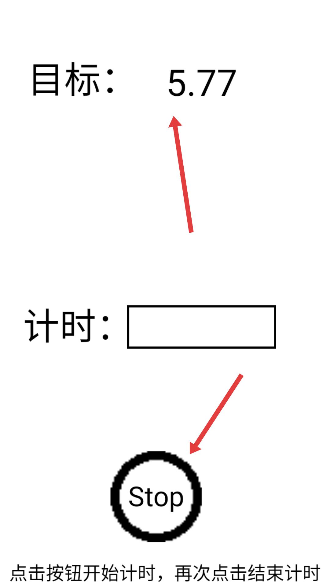 3、界面顯示目標時間,有Stop按鈕,點擊按鈕開始計時,再次點擊結束計時,盡量讓計時接近目標時間,獲取高分。