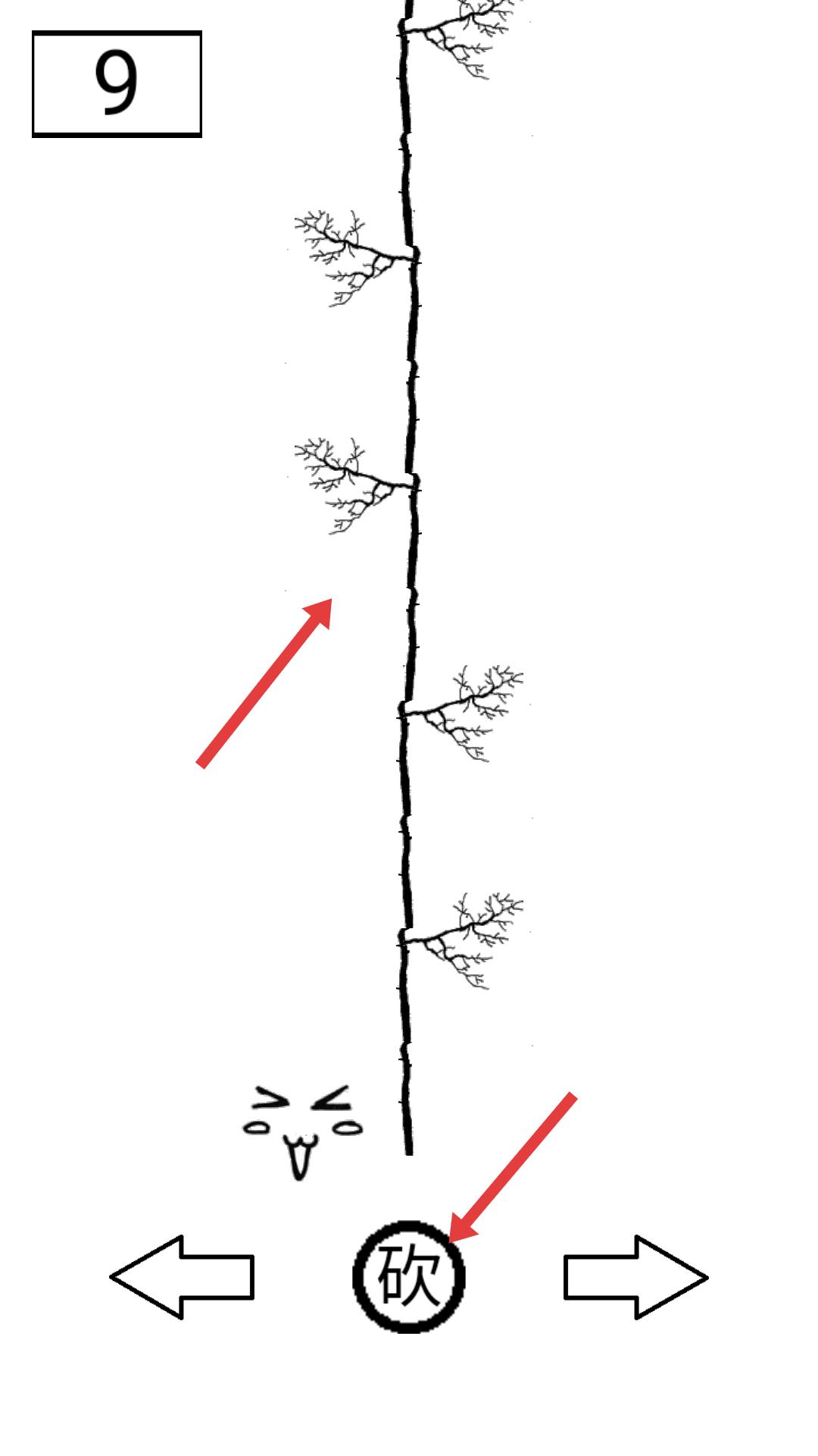 4、界面有豎長的樹和砍按鈕,左右還有箭頭,需點擊砍按鈕,同時可借助左右箭頭調整,砍伐樹木,推進游戲。