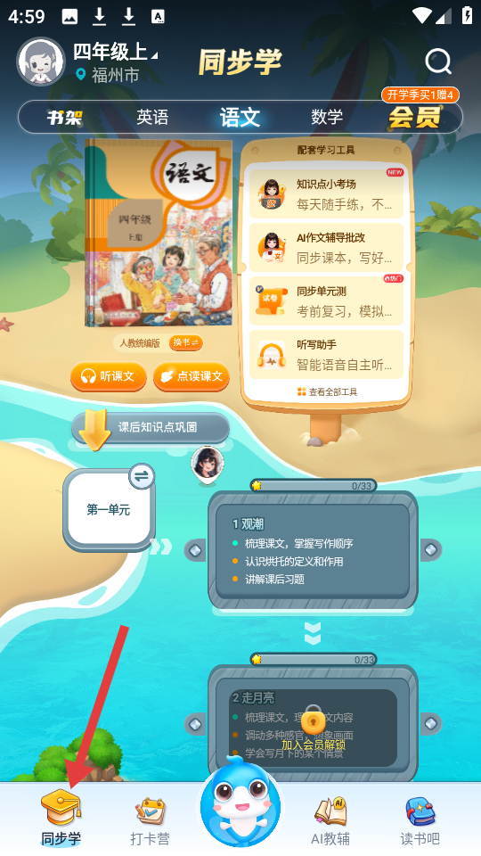 1、同步學APP首頁定位福州,呈現四年級上冊學習內容,涵蓋書架與多學科欄目,具備聽點讀課文等功能助力課后知識鞏固。