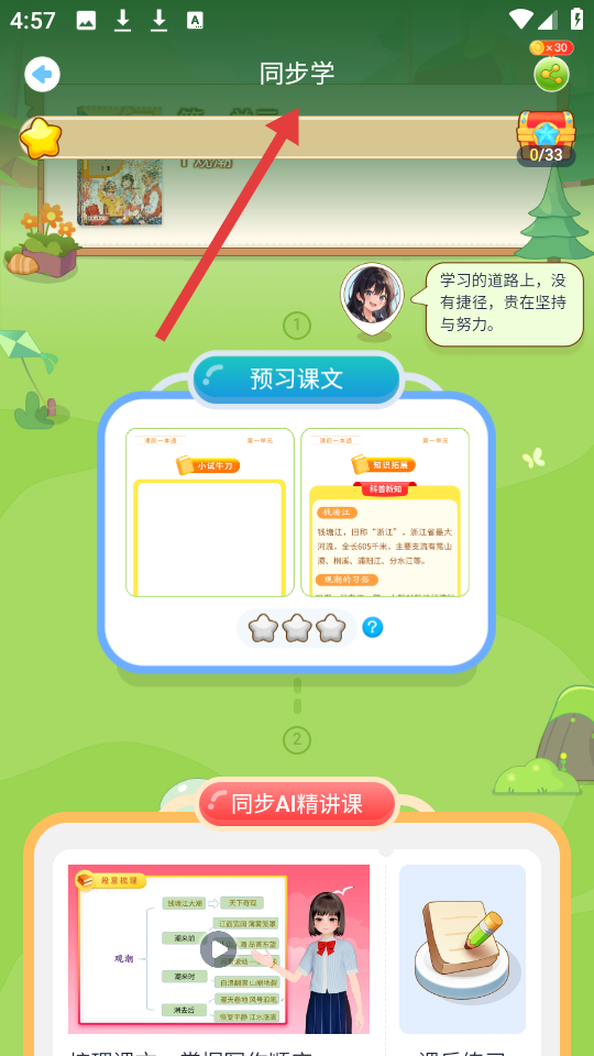 2、同步學另一界面以清新綠為主,設有預習課文和同步AI精講課區域,用勵志話語鼓勵學習提升知識掌握度。