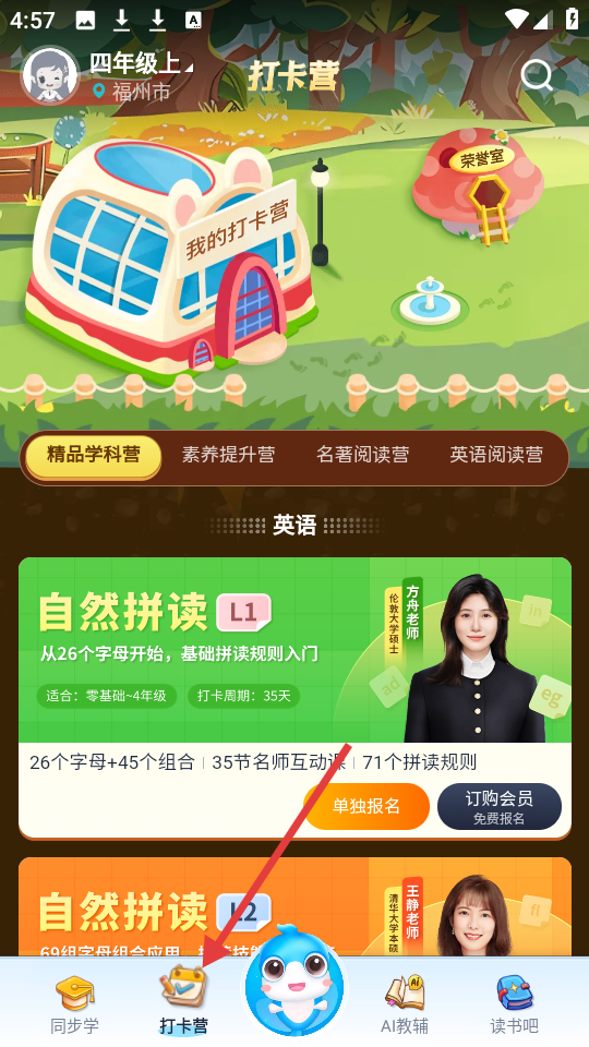3、打卡營頁面展示多樣學習營,像自然拼讀課程由名師授課,適合低年齡段提供單獨報名與會員免費報兩種方式。