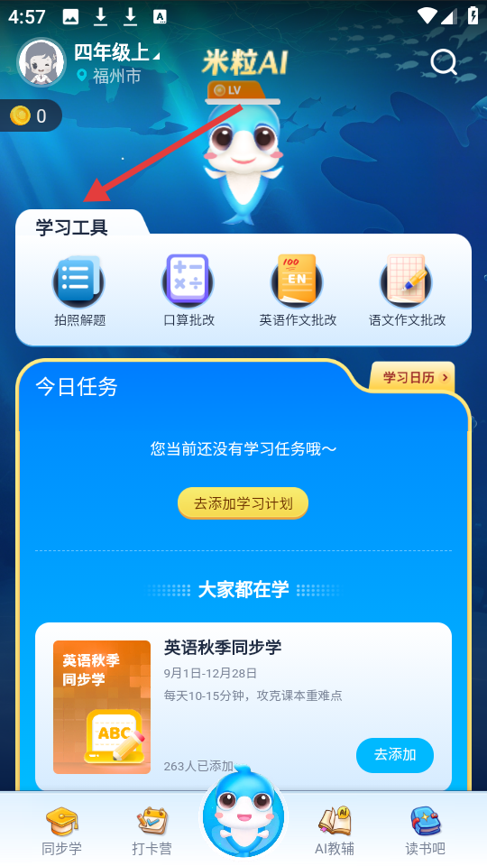 4、點擊教輔頁面有可愛米粒AI,集合,拍照解題等實用學習工具,還展示今日任務及熱門學習課程方便安排學習。