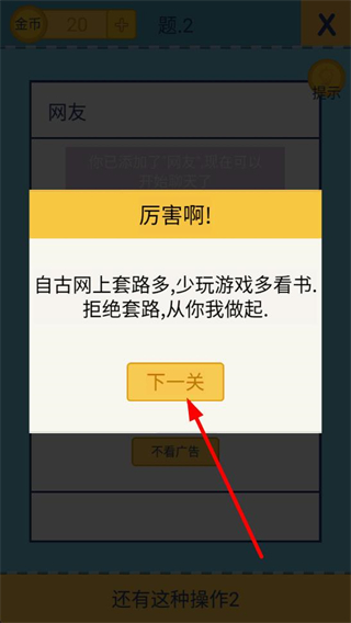 4、拒絕套路后點擊下一關,繼續體驗腦洞答題的樂趣,挑戰更多趣味題目,推進游戲進程。