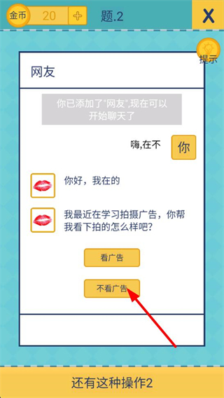 3、在聊天場景里拒絕套路選擇不看廣告,避開陷阱,完成關卡挑戰,獲取通關獎勵。