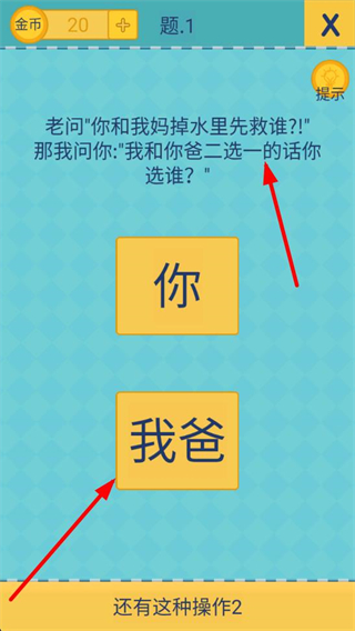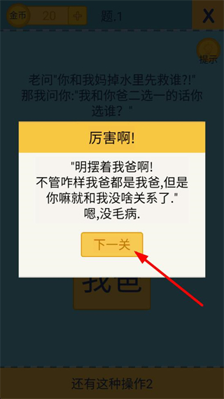 還有這種操作2游戲是一款非常有趣的解謎小游戲,游戲因為畫面簡潔,玩法簡單而廣受玩家好評,并且該游戲經常會給玩家出一些送命題,比如你媽和你女友掉水里了,你救誰?等,有想挑戰的可以到當易網下載體驗!