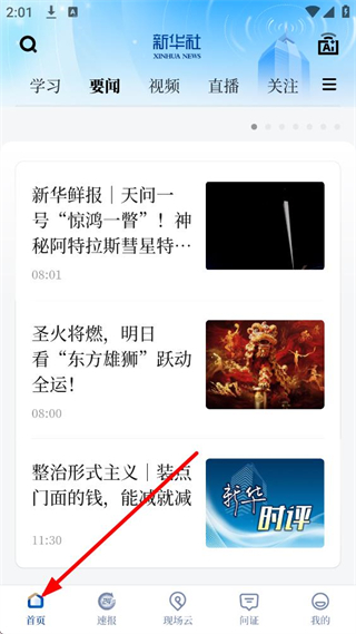 1、進入新華社應用首頁,有學習、要聞等新聞分類,展示各類新聞資訊,底部導航欄有首頁、速報等選項,方便用戶瀏覽新聞和使用功能。