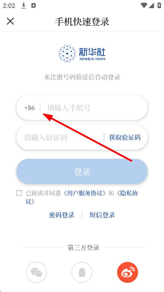 3、手機快速登錄頁面,可輸入手機號,獲取并輸入驗證碼,勾選同意用戶服務協議和隱私協議后點擊登錄。