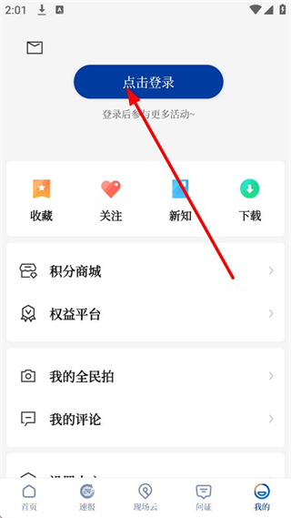 2、點擊我的進入個人頁面,顯示點擊登錄入口,有收藏、關注、新知等功能選項,還有積分商城、權益平臺等板塊,登錄后可參與更多活動。