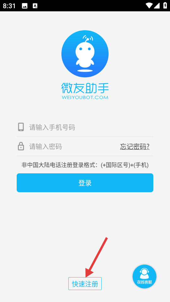 3、若已有賬號在登錄界面輸入手機號碼和密碼,然后點擊登錄按鈕即可登錄,如果還沒有賬號要點擊界面下方的快速注冊按鈕,按照提示步驟完成注冊后再進行登錄操作。
