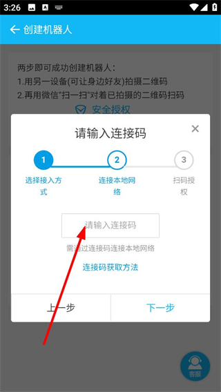 3、進入創建機器人頁面,按提示先輸入連接碼,完成連接本地網絡的步驟,后續還需掃碼授權,兩步操作即可完成機器人的創建流程。
