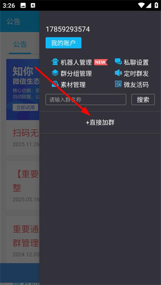 2、展開菜單后,可看到我的賬戶機器人管理私聊設置等功能,找到加號直接加群選項,點擊即可進入加群相關操作流程,拓展社群管理場景。