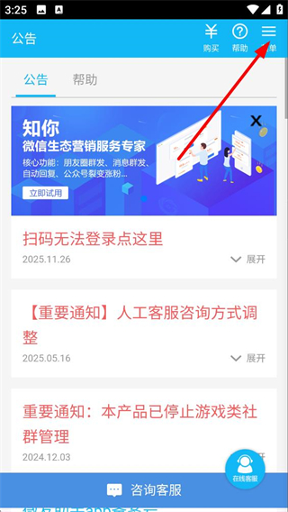 1、進入工具首頁,可查看公告及幫助內容,點擊右上角菜單按鈕,能展開功能選項欄,獲取賬戶及各類管理功能的入口,方便后續操作。