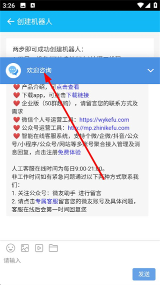 4、咨詢界面可查看產品介紹下載鏈接等信息,還能了解人工客服線時間,非工作時間可通過公眾號留言或專屬客服留言反饋問題。
