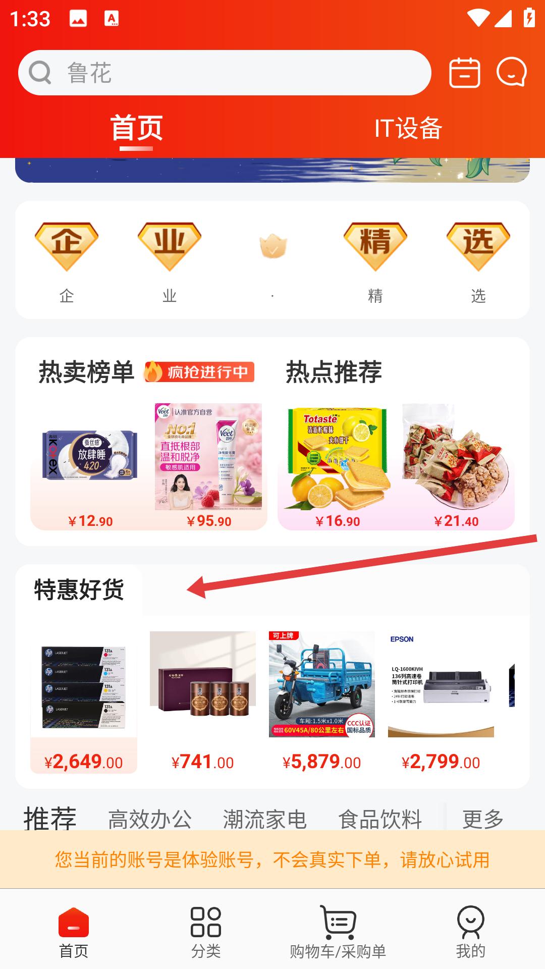 1、進入首頁看到熱賣榜單、特惠好貨等板塊,還有企業精選等分類,可根據需求瀏覽不同板塊和分類的商品,尋找想要采購的物品。