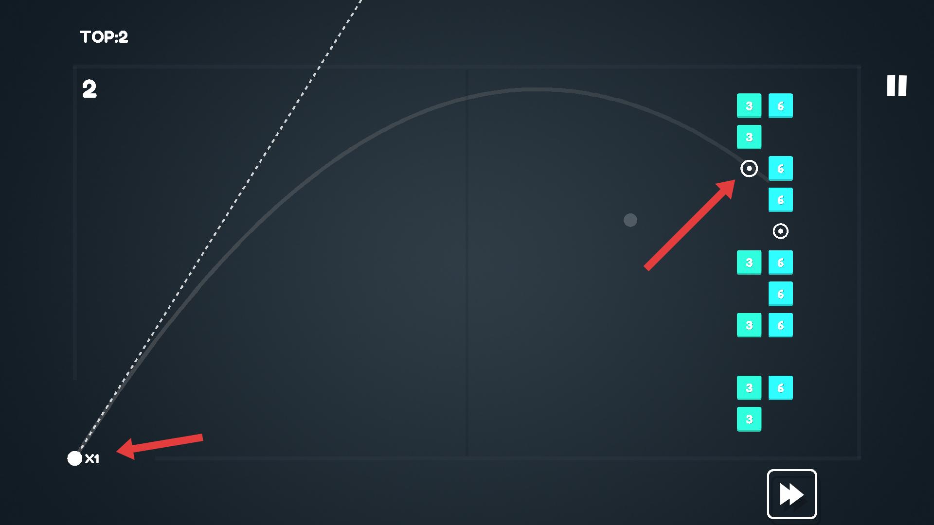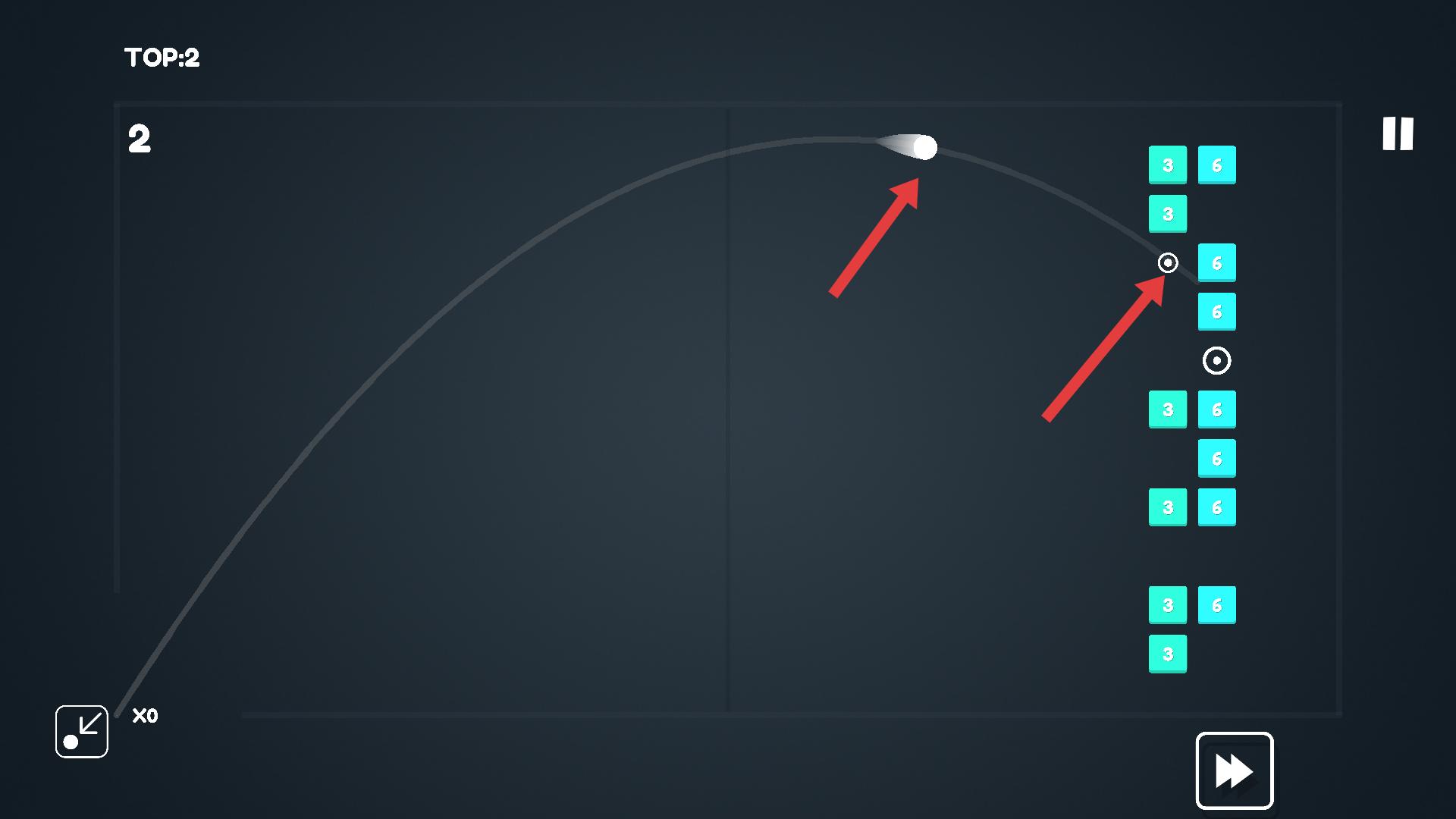 3、右側方塊標有3,6,左下角有小球,需瞄準方塊調整小球發射角度,讓小球撞擊方塊,積累分數。