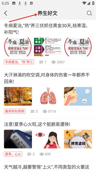 1、養生好文界面展示冬病夏治、吹空調危害、夏季心火等多篇養生科普文章,助力用戶全面獲取季節性養生知識。
