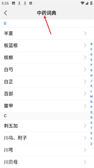 3、中藥詞典界面按字母分類展示半夏、板藍根等多種中藥名稱,方便用戶精準且高效地查詢中藥信息。