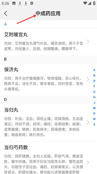 4、中成藥應用界面按字母分類展示艾附暖宮丸等中成藥,標注功效與適用癥,助力了解中成藥應用方法。
