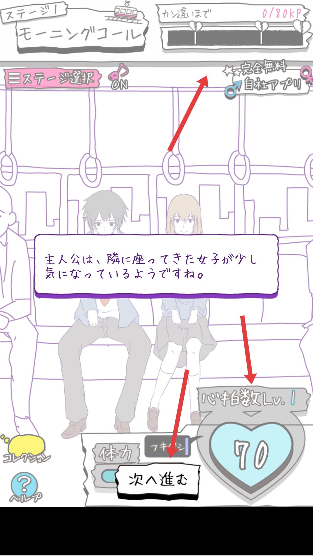 4、主角對旁邊坐的女生有點在意,界面有進度條、心跳數等元素,點擊下一步,關注與女生的互動及數值變化。