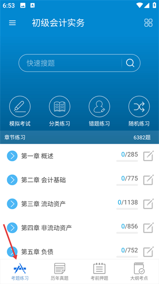1、初級會計實務考題練習界面設模擬考試等功能,按章節劃分習題,展示各章題量,助力考生按模塊系統練習知識點。