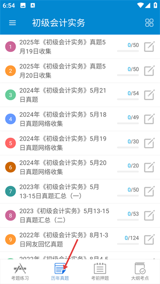 2、歷年真題界面展示近年初級會計實務真題,標注題量與收集時間,便于考生熟悉考試題型與命題規律。