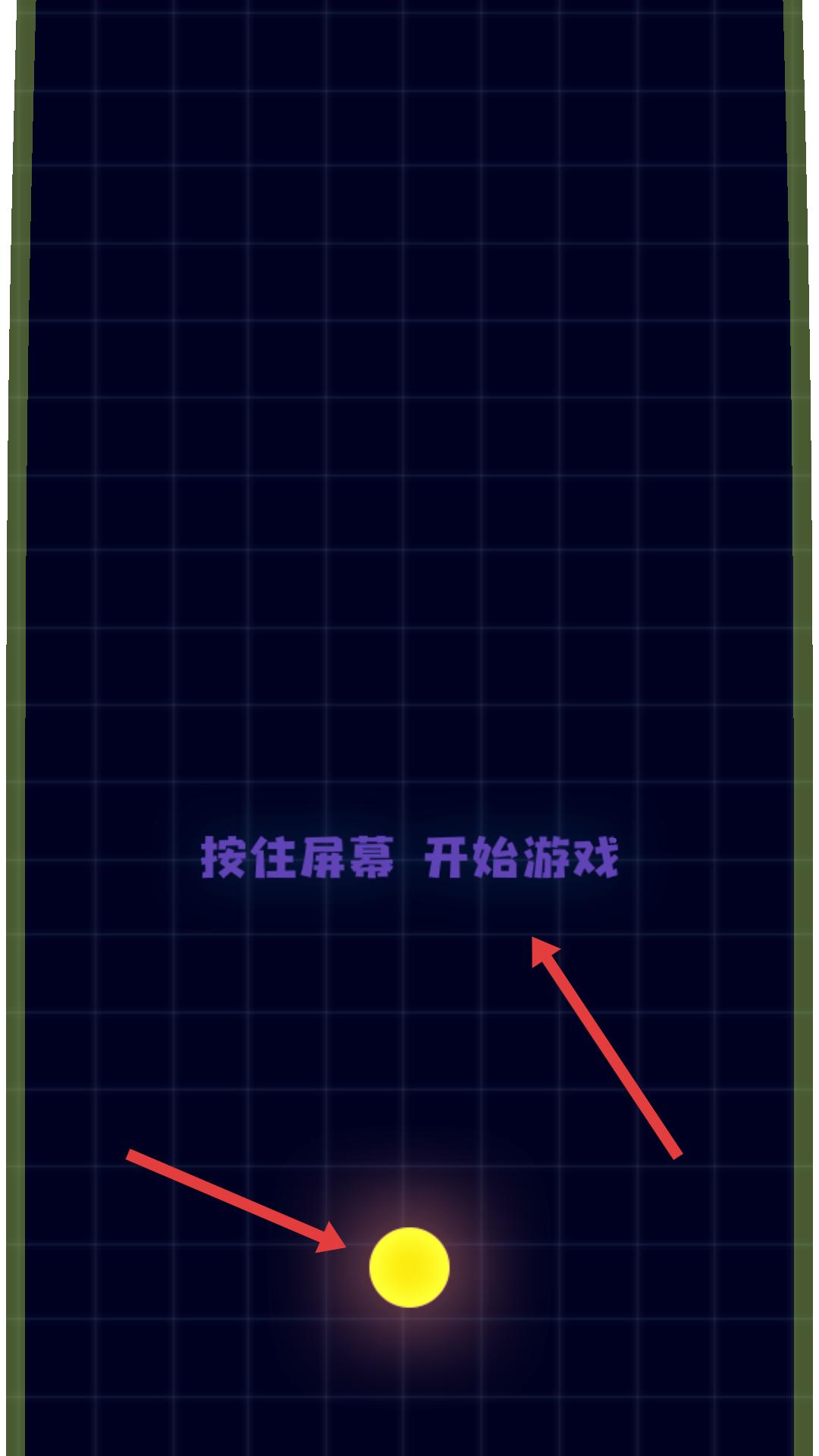 1、界面提示按住屏幕開始游戲,下方有小球,按住屏幕讓小球開始移動,開啟游戲挑戰。