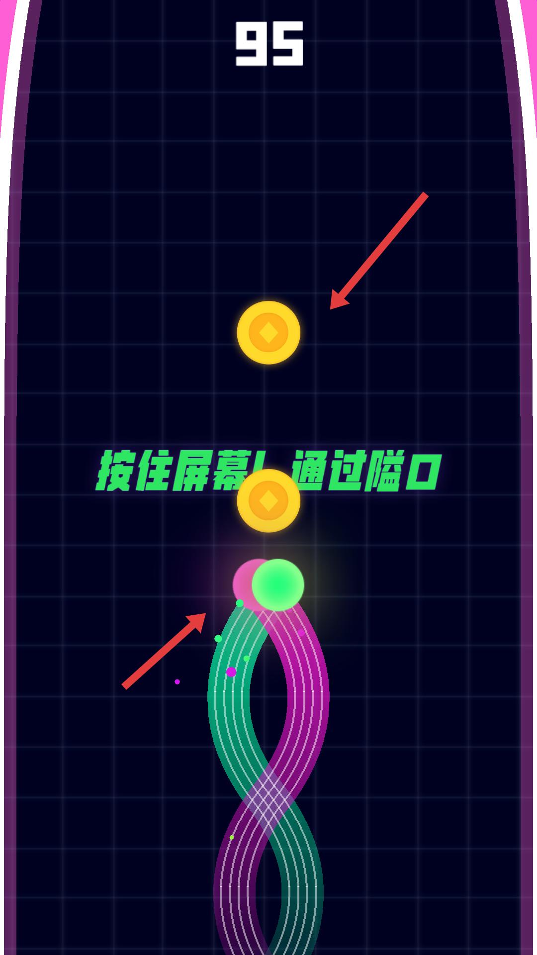 2、出現彩色通道和金幣,提示按住屏幕通過隘口,按住屏幕,操控小球沿通道移動,收集金幣,同時順利通過隘口。