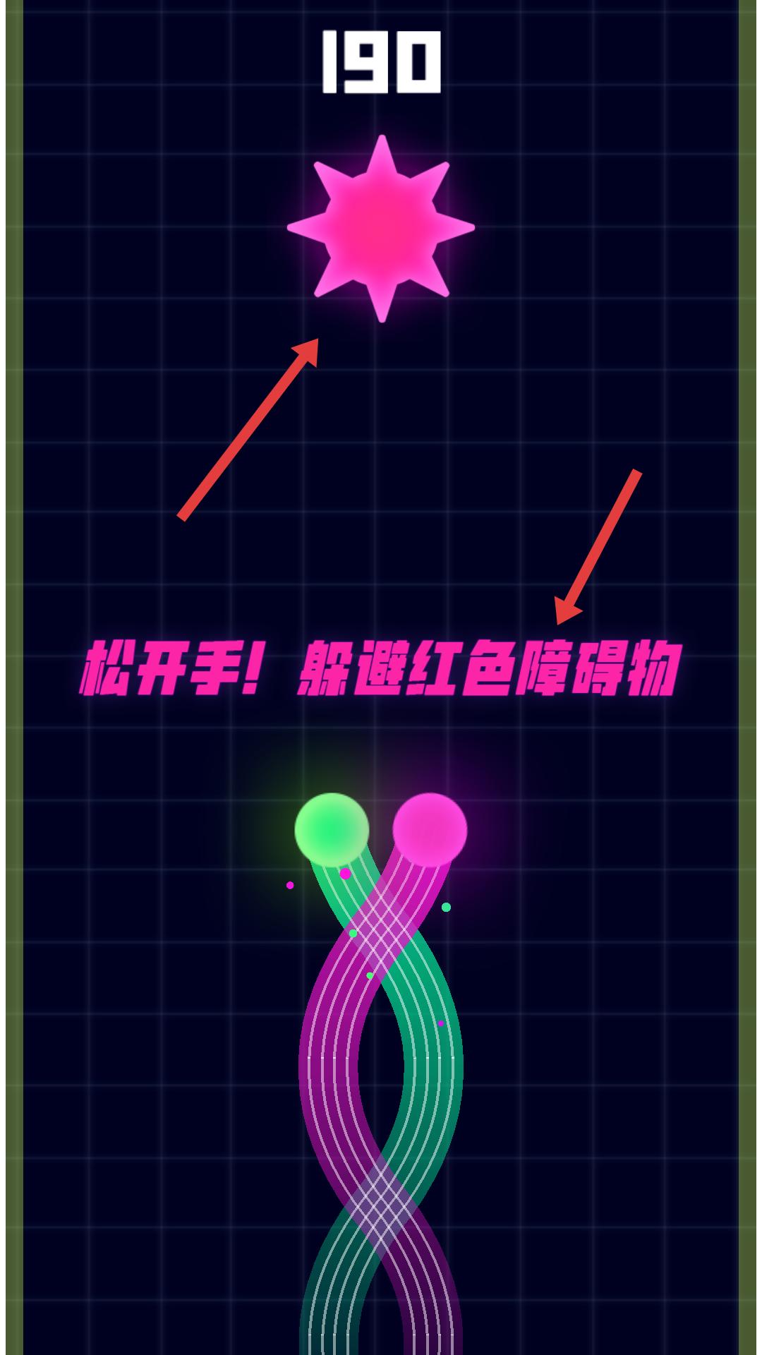 3、上方有紅色星形障礙物,提示松開手躲避紅色障礙物,在接近障礙物時松開手,讓小球避開紅色障礙物,繼續前進。