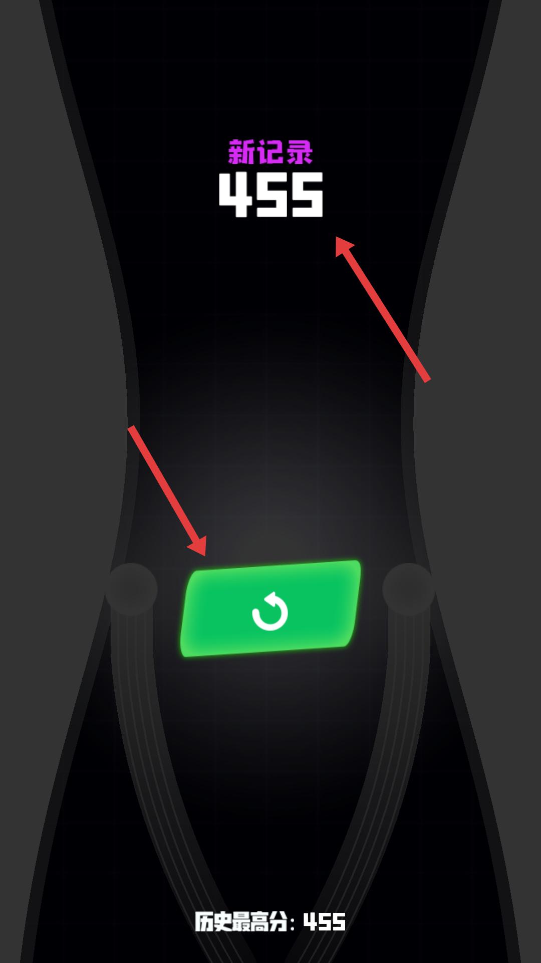 4、游戲結束后顯示新記錄分數,下方有綠色重玩按鈕,若想挑戰更高分數,點擊綠色重玩按鈕,重新開始游戲。