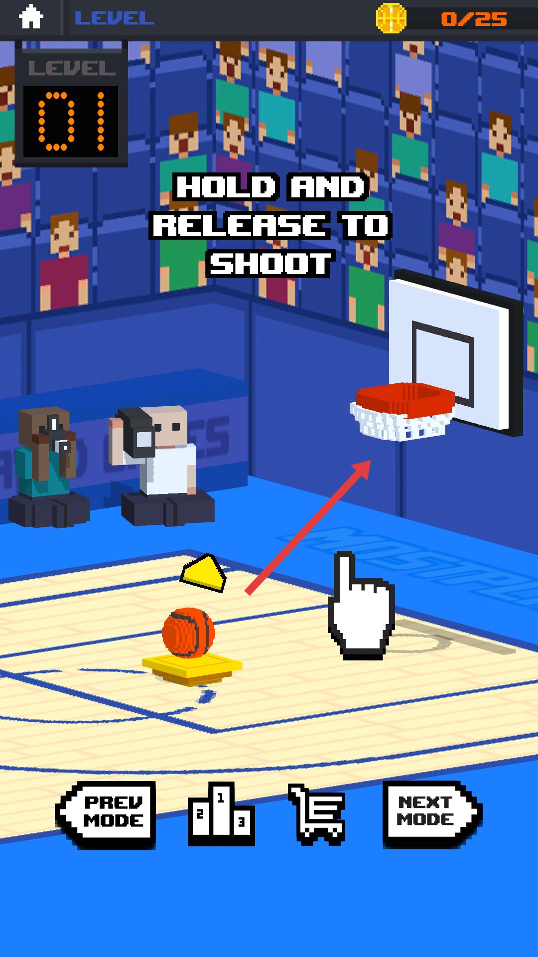 2、游戲提示按住并釋放投籃,按住屏幕控制投籃力度和角度然后釋放,讓籃球朝著籃筐方向投出,嘗試進球。