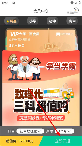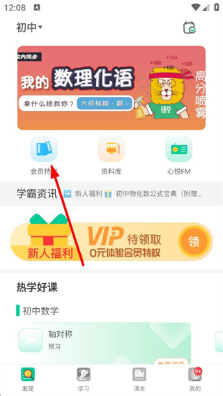 1、初中學習平臺發現頁面,點擊會員特權選項進入會員中心,可查看不同學段的會員套餐,選擇初中數理化三科的VIP會員套餐。